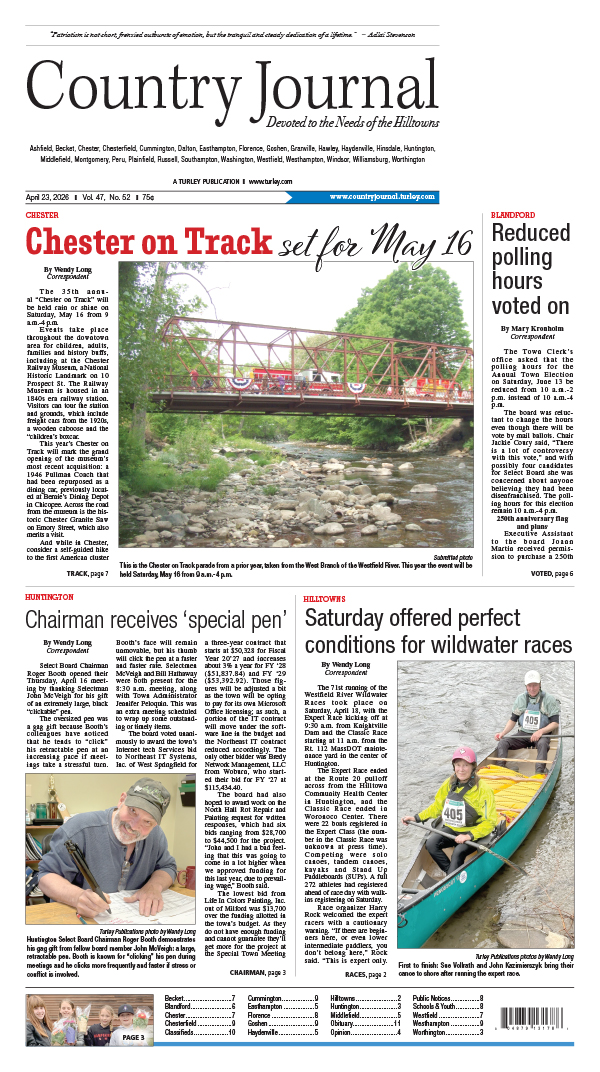 Becket, Blandford, Chester, Chesterfield, Cummington, Goshen, Huntington, Middlefield, Montgomery, Otis, Plainfield, Russell, Sandisfield, Westhampton, Williamsburg, Worthington